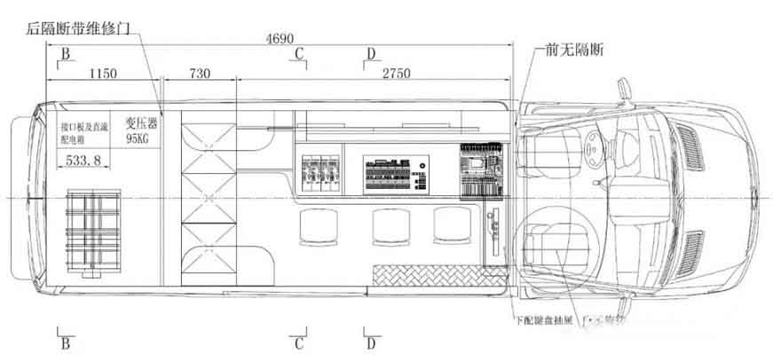 车体由奔驰515原厢式车体进行改装,右侧含侧拉门,外观尺寸7345×1930×2710mm,车型适中、轻便灵活,能适应城镇郊区复杂路况行驶。车顶配置大功率顶置空调、高清摄像机、可升降的倒伏长距离探照灯、爆闪灯等等,电力系统包括交流(380V及220V)和直流二大部分构成;通过配电盘进行分相、分区、分类控制和监测。交流部分包括:隔离变压器、稳压器、UPS等,直流由充电机和8+1块100AH蓄电池组成。车内装饰采用新型环保创新材料,操作台及技术柜包含两侧采用可调角度日光灯,车内配有直流逆变日光灯,各机柜后部、电缆仓、各储物箱均考虑照明,增添了备氛围灯效果,整体设计浑然一体。最大化设计储物空间,所有系统设备都可以随车携带。