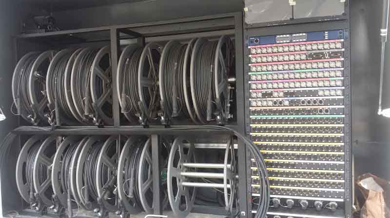 配备电源电缆盘、音频电缆盘。电缆回收安全快捷,各电缆盘可同时或者分别控制。盘面选用成型铝制盘面。电缆盘架为钢管焊接,表面喷塑。
